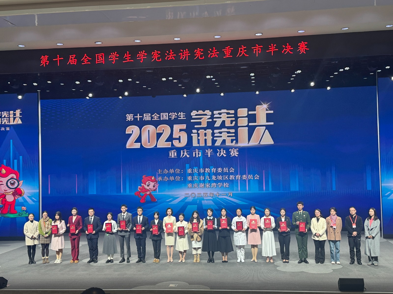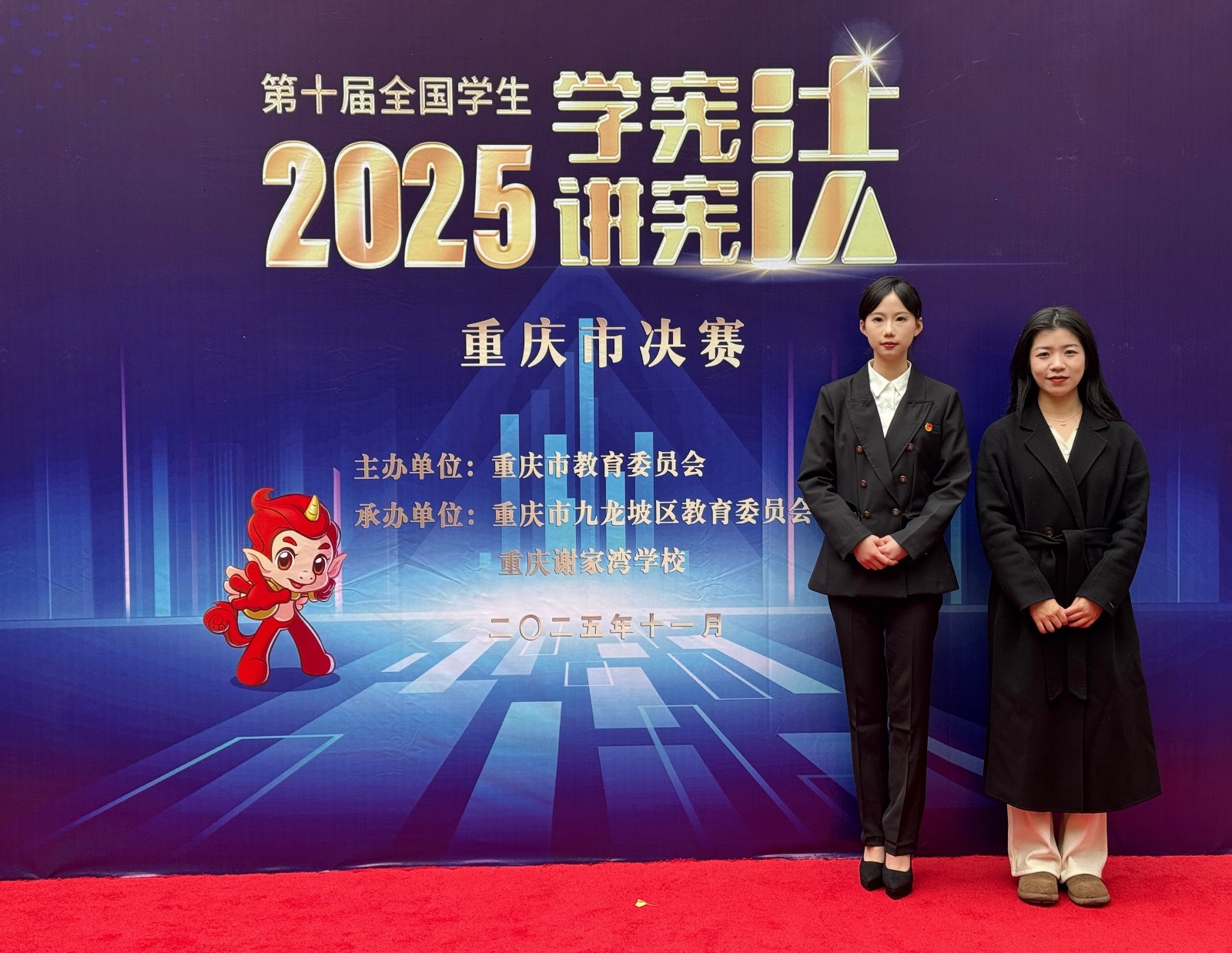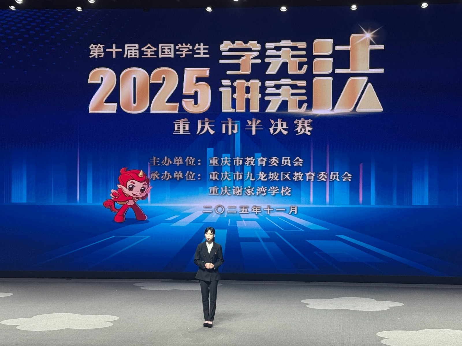 2025年11月22日至23日,第十届全国学生“学宪法讲宪法”活动重庆市决赛在重庆谢家湾学校举行,我院2024级工程造价1班专业学生马彦渝同学凭借出色表现,荣获演讲比赛二等奖。